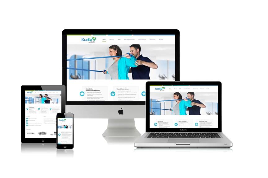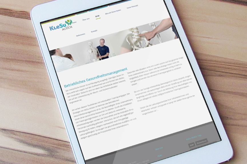 Mit KleSu Motion haben wir eine junge Marke im Bereich des Betrieblichen Gesundheitsmanagements entworfen. Passend dazu sind das Unternehmenslogo, die Website und die Geschäftsausstattung modern gehalten. Eine besondere Farbgebung verleiht Frische und Seriosität. Das responsive Webdesign ermöglicht die Nutzung auf allen gängigen Endgeräten.
